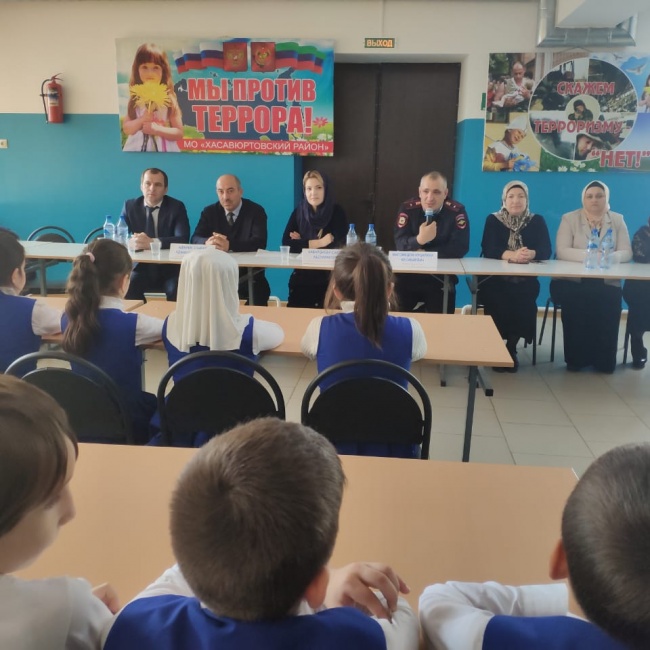 В работе группы приняли участие главный специалист комиссии по делам несовершеннолетних и защите их прав Саида Кабардиева,  старший участковый УУП и ПДН ОМВД России по Хасавюртовскому района  Нуцалхан Магомедов и начальник отдела по антитеррористической работе Эльмар Аджиев.  Целью визита было повышение правовой грамотности учащихся с 1-х по 11-е классы  по вопросам соблюдения комендантского часа, личной и общественной безопасности, а также проблемы распространения идеологии терроризма в подростковой среде.