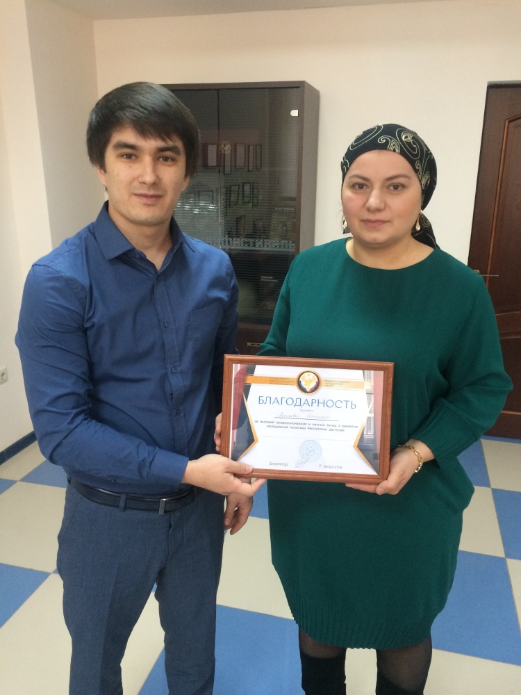 В ведомстве отмечают хорошую работу с молодежью в районе и те мероприятия, которые проходят в памятные и другие даты, с широким охватом молодежи. Особо хочу подчеркнуть вклад молодежи района, при проведении мероприятий ко Дню Победы, Дня защитника Отечества и Дня народного единства. В заключении Рашид Максудов вручил Благодарность Дженнет Адиловой – « За высокий профессионализм и личный вклад в развитие молодежной политики РД за 2017г»