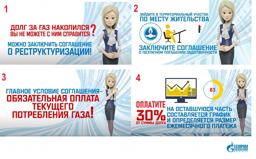 Компания «Газпром межрегионгаз Махачкала» предоставляет возможность для абонентов–физлиц, имеющих долги по оплате газа, заключить соглашения о реструктуризации задолженности.