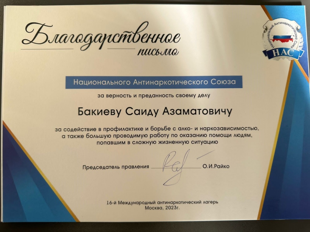 За содействие в профилактике и борьбе с алконаркозависимостью а также большую проводимую работу по оказанию помощи людям, попавшим в сложную жизненную ситуацию, Благодарственным письмом Национального Антинаркотического Союза Российской Федерации отмечен Саид Бакиев, ответственный секретарь Антинаркотической комиссии в МО «Хасавюртовский район».