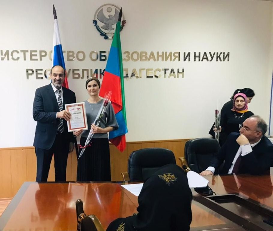 Накануне в Министерстве образования и науки Республики Дагестан прошло торжественное вручение Дипломов победителям Конкурса «Воспитатели России». Дипломами I - степени были награждены учитель - логопед МБДОУ детский сад «Ласточка» Шихсолтанова Альбина в номинации «Молодые специалисты» и воспитатель МБДОУ детский сад «Ромашка» Адаева Зарипат в номинации «Успешный воспитатель» республиканского этапа IX Всероссийского конкурса «Воспитатели России». Дипломы победителям вручал Министр образования и науки РД Яхья Бучаев.