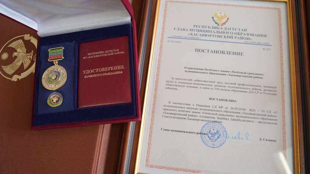11 сентября по поручению Главы МР Джамбулата Салавова, делегация администрации района посетила председателя Совета ветеранов района, Заура Алхаматова, с целью вручения нагрудной медали и удостоверения «Почетный гражданин МО «Хасавюртовский район» « За многолетний добросовестный труд, высокий профессионализм, значимый вклад в социально-экономическое развитие муниципального района, активную общественную позицию, в связи со 100-летием образования ДАССР и 75-летним юбилеем».