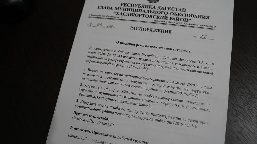 « Указ Главы РД №17 « О введении режима повышенной готовности », в соответствии с Федеральным законом от 21 декабря 1994 г. No68 - ФЗ « О защите населения и территорий от чрезвычайных ситуаций природного и техногенного характера», издан на территории региона в целях недопущения распространения коронавирусной инфекции. В Хасавюртовском районе эпидемическая обстановка благоприятная, тем не менее необходимо принять все превентивные меры и быть готовыми к любым ситуациям. С момента выхода Указа на территории района с 19 марта 2020 года введен режим повышенной готовности. На контроле запрещение проведения до особого распоряжения, спортивных, зрелищных, культурно – массовых мероприятий. Утвержден районный штаб, в составе ответственных работников аппарата администрации, здравоохранения, управления по делам «ГО ЧС и МП», организаций и служб. Все граждане, прибывающие в район, особенно из мест признанных неблагополучными, должны находиться под наблюдением врачей. Здравоохранению района обеспечить поддержание необходимого запаса противовирусных препаратов, в том числе рекомендованных для лечения коронавирусной инфекции (2019-nCoV), дезинфекционных средств и средств индивидуальной защиты в лечебных учреждениях района. Особое внимание уделить профилактике по предупреждению возникновения инфекционных заболеваний, с привлечением СМИ для информирования населения о текущих процессах» - подчеркнул Джамбулат Салавов.