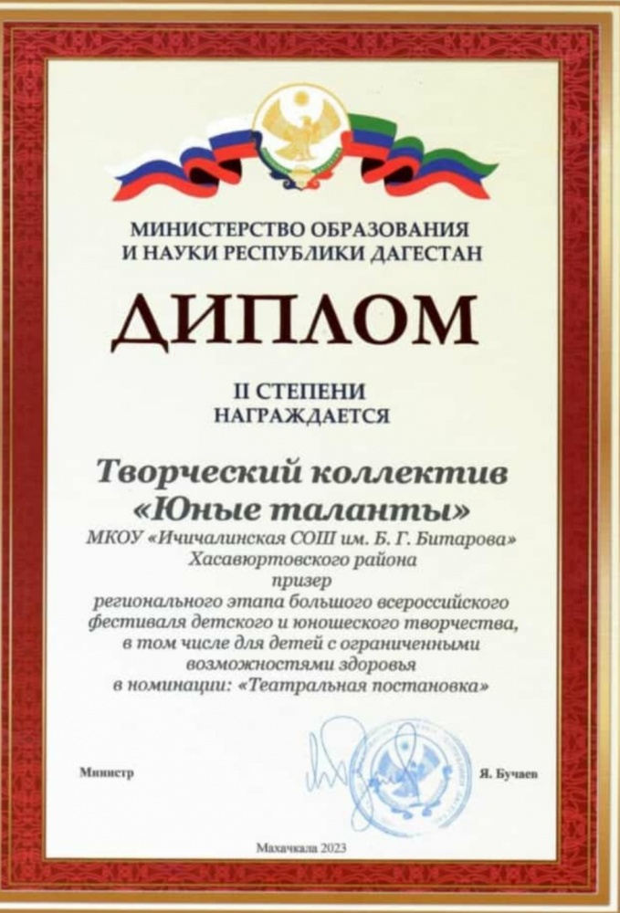 Творческий коллектив ЦТКНР “Юные таланты” селения Ичичали Хасавюртовского района стали призерами регионального этапа Всероссийского фестиваля детского и юношеского творчества в номинации “Театральная постановка”. Это результат совместной работы работников культуры и образования-учительницы родного языка Айшат Зубаировны и режиссера народного театра Башира Шахбанова. Результат не случаен, мог быть и выше , в селе функционирует один из лучших театров в республике, которым руководит Башир Шахбанов, лауреат Премии Правительства РД “Душа Дагестана”. При центре культуры Ичичали также функционирует детско-юношеская театральная студия ,где занимаются и участники творческого коллектива Ичичалинской СОШ “Юные таланты”.