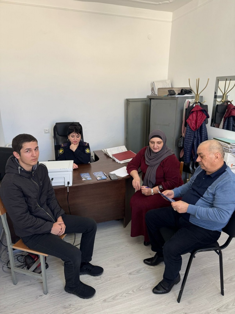 Так, главным специалистом отдела АТР Абдурашидом Гамзатовым, главным специалистом отдела ОДН и ЗП Анжелой Осиевой совместно с заместителем начальника МФ ФКУ УИИ УФСИН России по Республике Дагестан Пирмагомедом Аглархановым проведена профилактическая беседа с осужденным к ограничению свободы за преступления террористического характера жителем села Тотурбийкала.