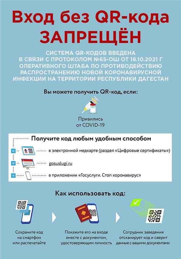 Министерство промышленности и торговли Республики Дагестан доводит до сведения жителей Хасавюртовского района о введении системы QR-кодов для посещения некоторых учреждений. Так, в соответствии с протоколом оперштаба по противодействию распространению COVID-19 №65-ОШ от 18 октября 2021г. ограничения коснутся: театров, кинотеатров, концертных залов, физкультурных, спортивных, выставочных и других культурных мероприятий, гостиничных и санаторно-курортных учреждений, торговых центров, торгово-развлекательных комплексов, заведений общепита, а также спортивных и физкультурно-оздоровительных центров, плавательных бассейнов, фитнес-залов, аквапарков, салонов красоты, косметических, массажных и спа-салонов, бань и саун.