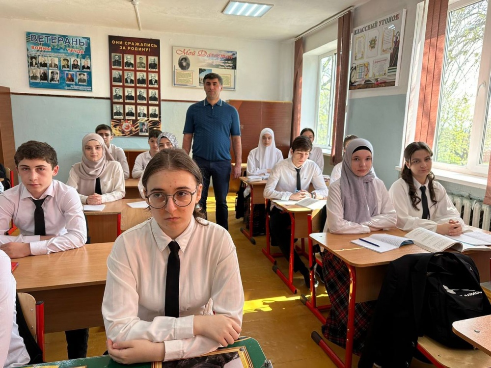 Урок прошел в МКОУ «Тотурбийкалинская СОШ им. А.К. Кабардиева» на тему «215 лет со дня рождения Н.В. Гоголя». После завершения урока Крымсолтан Кабардиев побеседовал с выпускниками о предстоящих экзаменах, ответил на интересующие их вопросы про ОГЭ, дал советы и пожелал им удачи!