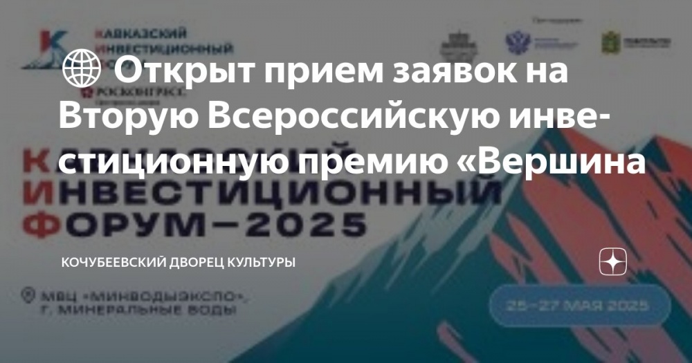 Министерство экономического развития Российской Федерации объявляет о начале приема заявок на участие во Второй Всероссийской инвестиционной премии «Вершина» 3 февраля 2025 года. Церемония награждения лауреатов состоится в рамках Кавказского инвестиционного форума, который пройдет с 25 по 27 мая 2025 года в МВЦ «МинводыЭкспо» (г. Минеральные Воды). Организатор КИФ – Фонд Росконгресс при поддержке Министерства экономического развития Российской Федерации.