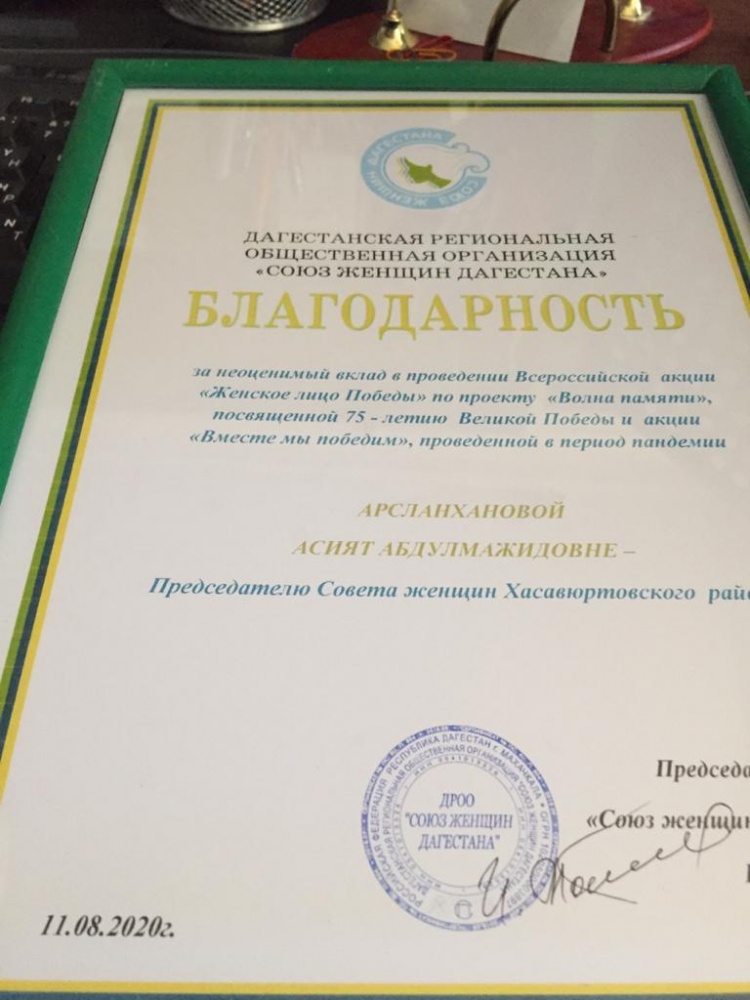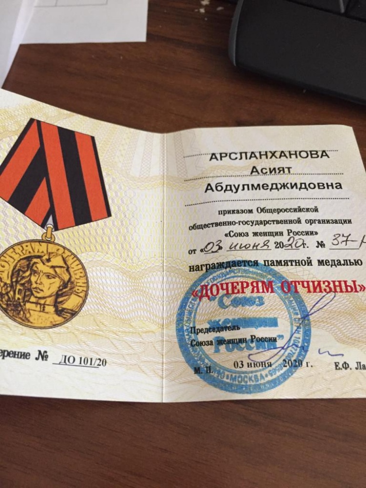 В основном, среди тех, кто удостоился поощрения, председатели Союза женщин районов и городов. Все те, кто организовывали помощь дагестанцам. Памятной медалью Союза женщин России «Дочерям России» наградили и председателя Союза женщин Хасавюртовского района Асият Арсланханову. Она также награждена Благодарственным письмом Союза женщин Дагестана.