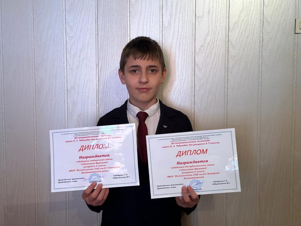 Ученик 6 "а" класса МКОУ "Ичичалинской СОШ им. Б. Г. Битарова" Гаджиалиев Мухаммад стал победителем 12 математической олимпиады имени П.Л. Чебышева для учащихся 5-7 классов.