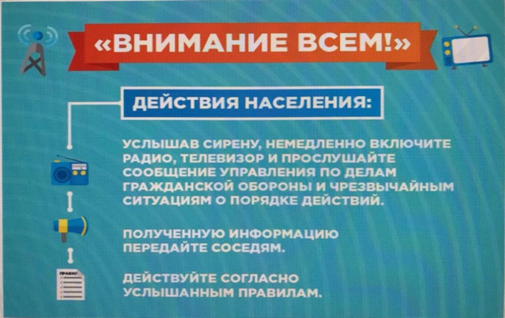 При этом необходимо включить телевизор, радиоприемник, репродуктор радиотрансляционной сети и прослушать сообщение о нижеперечисленных сигналах или информацию о действии в ЧС.