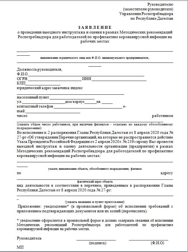 Руководителю организации необходимо заполнить заявление установленной формы Роспотребнадзором РД в электронном виде (прилагается).