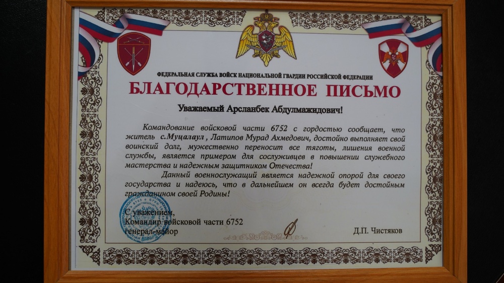 В адрес Главы МР поступило Благодарственное письмо Командования части на участника СВО из Хасавюртовского района