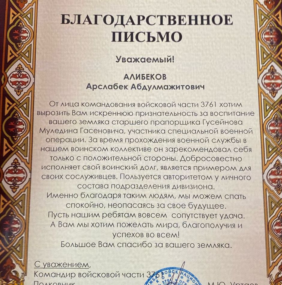 / В адрес Главы МР поступило очередное Благодарственное письмо Командования части МО РФ на военнослужащего из Хасавюртовского района