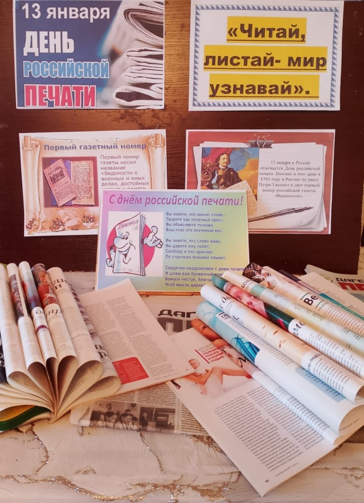 В библиотеках селений Октябрьское, Карланюрт, Хамавюрт, Муцалаул, к этому дню организованы стенды различных видов изданий печати: газет, журналов, произведений разных жанров в рамках подготовки ко Дню российской печати.