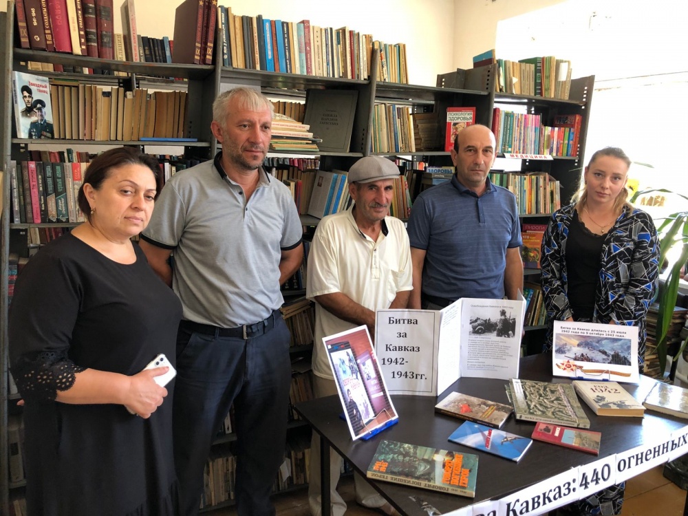 В беседе приняли участие работники администрации села: Бериев С – специалист по земельным налогам. Казиев Н. - ЖКХ, ДАГИРОВ З.- специалист по сбору налогов, Мамаева У. - директор СДК К беседе оформлена книжная выставка: « Битва за Кавказ: 440 огненных дня». Акайчиков Карлан – глава администрации села отметил - Битва за Кавказ, одна из крупнейших битв Великой Отечественной войны между рекой Дон и предгорьями Большого Кавказа.. Это была целая серия оборонительных и наступательных операций, проведенных на обширной территории в сложных условиях степной, горной и горно-лесистой местности, а также на побережье Чёрного моря. Зав.библиотекой Асевова Джаминат обратилась к молодежи - Всем нам, молодому поколению, необходимо чаще задумываться над тем, какой ценой оплачивается зыбкий мир на Северном Кавказе. И как легко из враждебной искры разжечь пламя войны.