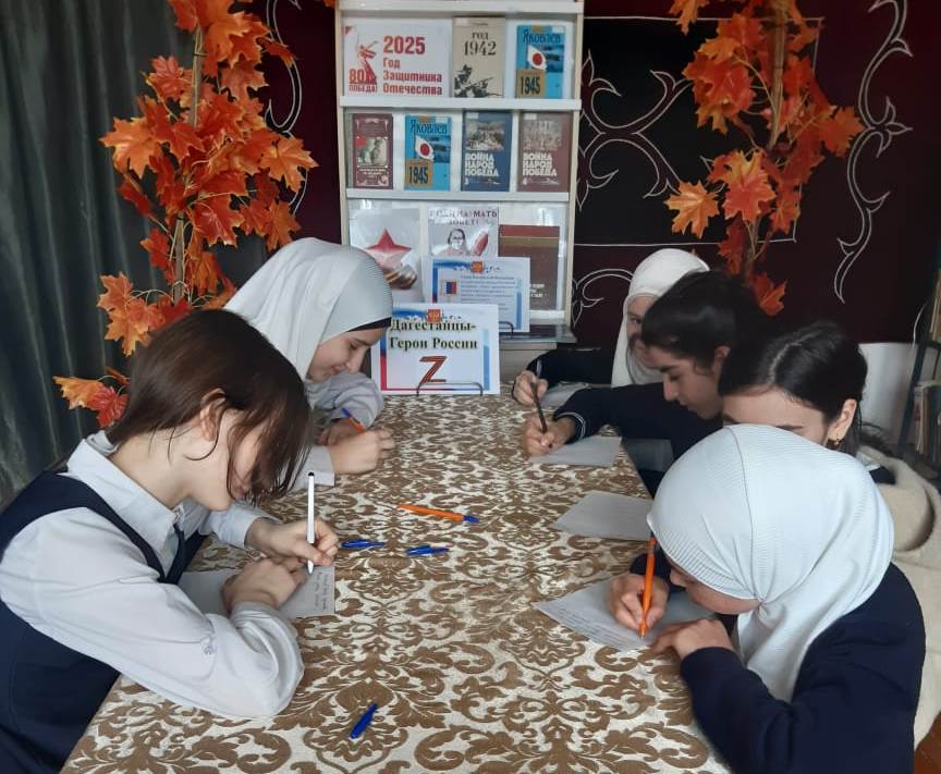В библиотеках поселений района, идет патриотическая акция «Письма участникам СВО». Акция в рамках Года защитника Отечества к 80 – летию Великой Победы, направлена на поддержку военнослужащих, добровольцев, участников СВО, защитников стратегических интересов Отечества. Юные читатели, каждый в своих письмах, выражая уважение и поддержку, также желают скорейшего возвращения домой. Также в библиотеках оформлены стенды «Дагестанцы - герои России», на которых представлены истории и фотографии земляков, достойно служащих своему народу. Эти стенды служат напоминанием о мужестве и самоотверженности дагестанцев, которые защищают интересы страны, и вдохновляет молодежь гордиться своими корнями и историей.