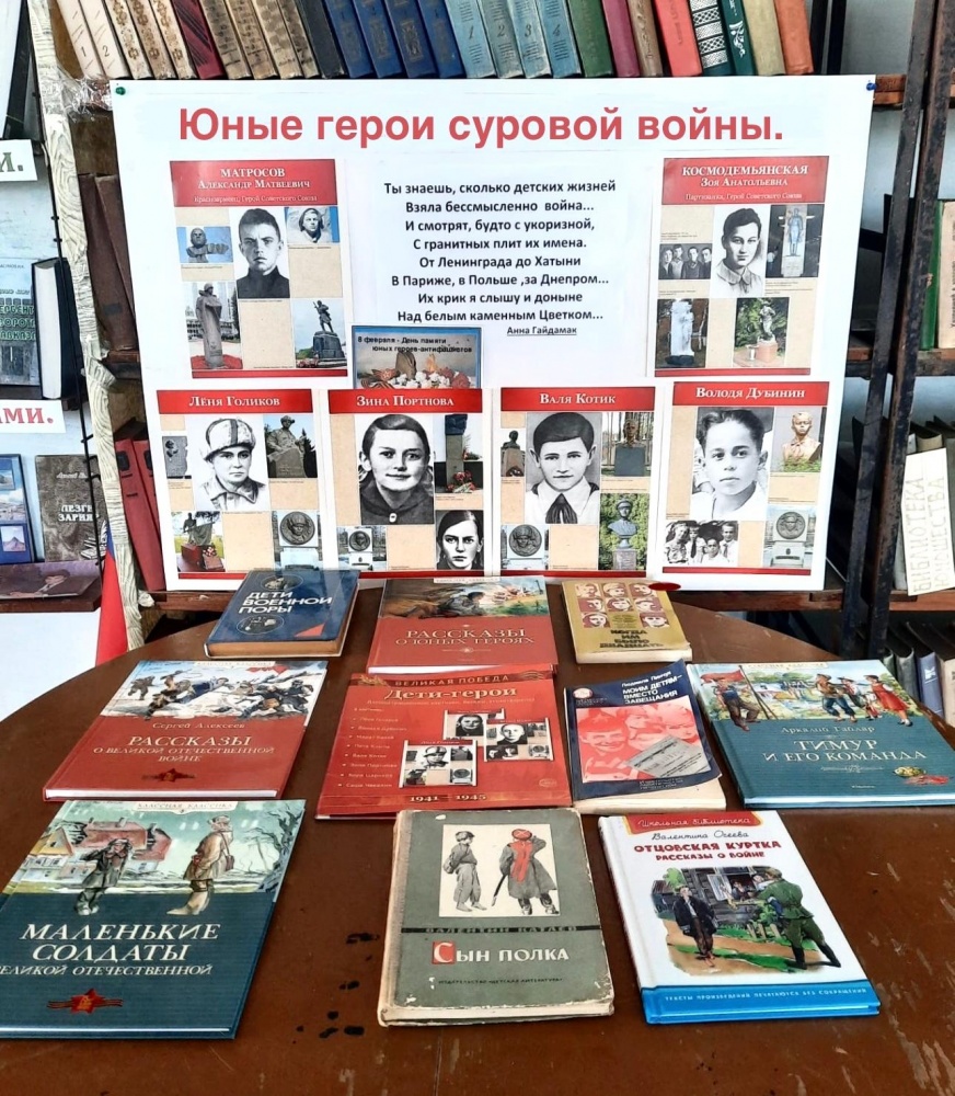В рамках мероприятий детям рассказывают о юных Героях -антифашистах, пионеров – Героев ВОВ, пионерах послевоенных лет, которые наравне со страной, поднимали ее из руин, о мальчишках и девчонках, которые за подвиги, совершённые в годы Великой Отечественной войны, были удостоены самой высокой награды Родины – звания Героя Советского Союза. К памятному дню также проходят уроки мужества «Огонёк памяти», «Война в памяти, в сердце, в книгах» для всех читателей библиотеки. Библиотекари рассказали ребятам о Лёне Голикове, Зине Портновой, Марате Казее, Вале Котике и других пионерах-героях, чей подвиг навеки останется в памяти поколений. Уроки сопровождаются обзором книг, представленных на книжной выставке «Дети-герои войны».