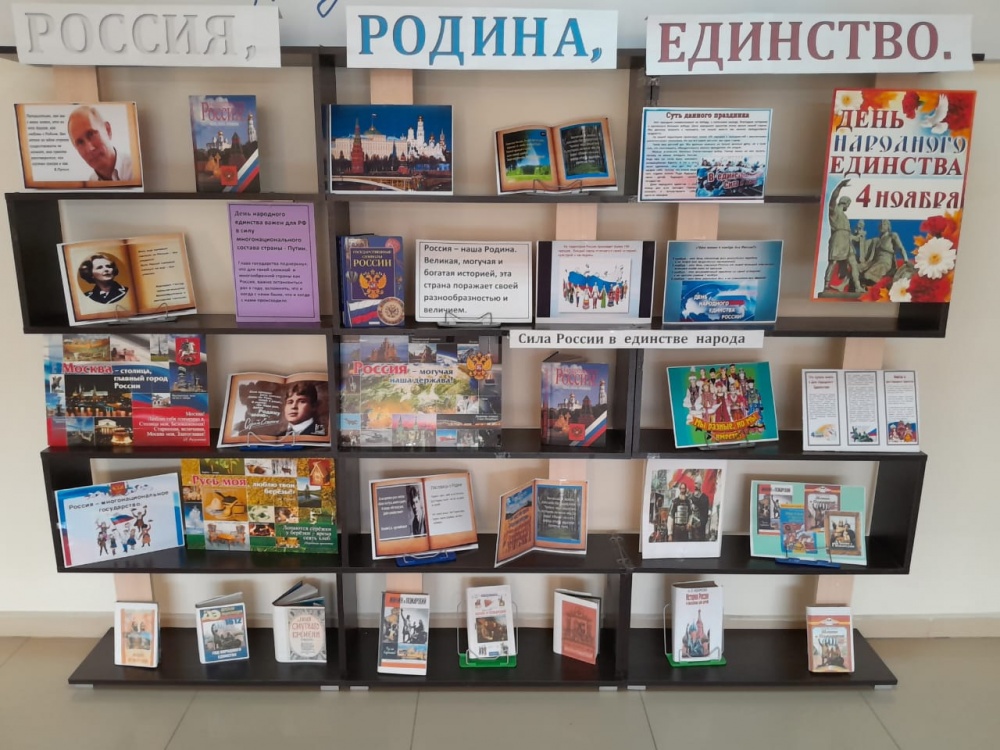 Для читателей в библиотеках были подготовлены книжные выставки : «В единстве наша сила», "Мы дружбой едины",» Единством славится Россия». "Мы едины-мы непобедимы», « День народного единства России»