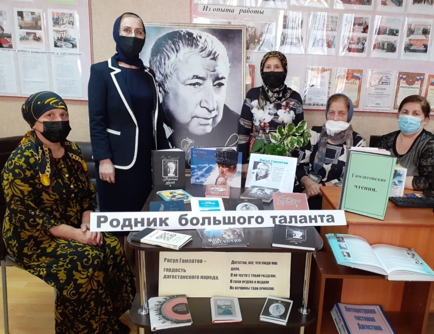 Отметим, что 8 сентября 2023 года исполнится 100 лет со дня рождения народного поэта Дагестана, прозаика, переводчика, публициста, общественного деятеля - Расула Гамзатовича Гамзатова. Его творчество любят и почитают во всем мире. Перу Расула Гамзатова принадлежат десятки проникновенных стихов, обогативших национальную, русскую и мировую культуру, он создал замечательные поэмы, сонеты, послания, афористические надписи, философские эссе. Накануне в ЦБС прошел Круглый стол « Родник большого таланта» , посвященный подготовке празднования 100-летия со дня рождения Расула Гамзатова. К мероприятию была оформлена книжная выставка. В своем выступлении директор ЦБС, Абасова Зульфия, отметила, что в рамках подготовительных мероприятий в библиотеках района годах проходят тематические мероприятия, в соответствии с планом по проведению празднования Юбилея Расула Гамзатова.