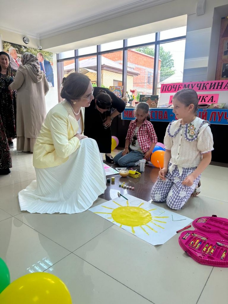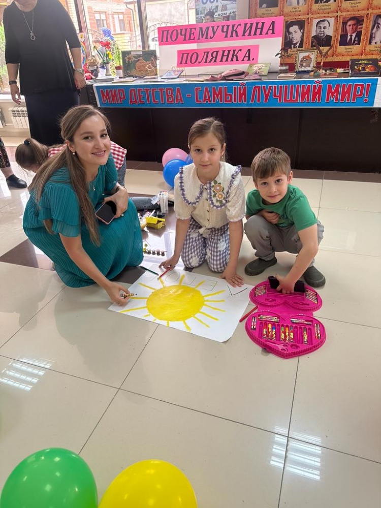 Заведующая библиотекой селения Генжеаул Саида Мутайханова открыла Праздник. Дети в зале Центра Традиционной Культуры пол превратили в разноцветный ковер, отразив на нем свои детские мечты. Рисовали: солнце, небо, цветы, шары, планету, свой дом, маму, одноклассников, самолет и многое другое. Своими рисунками ребята призывали к миру и добру – к залогу счастливого детства.