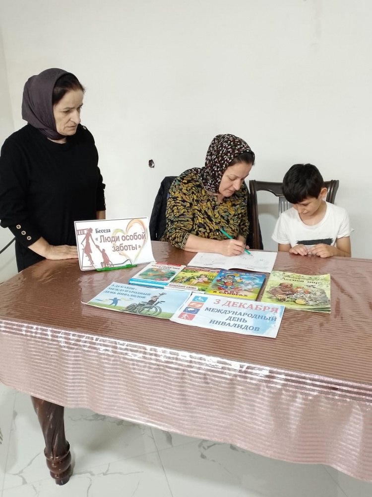 Зав. фил.45 и СДК с.Хамавюрт посетили на дому семью инвалидов Гримсултанова Рамзана и Тоиты. Гримсултанов Рамзан иТоита инвалиды со стажем. По воле случая бездетны. Зав. фил № 40 с. Сулевкент посетила детей инвалидов на дому вместе с метом СДК Алихановой Майсарат и специалистом по социальной работе реабилитационного центра для детей с ограниченными возможностями посетили детей инвалидов Мамаева Яхита и Абдуллаева Динислама. Зав. фил № 26 с.Муцалаул Умарова Патай и зав. СДК Тагировой З. В библиотеке , пригласила инвалида детства Умарова Марата Х.также пришли и родители, некоторых инвалидов посетили на дому. Ребенок инвалид детства: Исраилов М. Умаров М.Х. , Алиев Рамазан Халилова Алипат. Для приглашенных в библиотеку оформлены книжные просмотры. Своим посещением, работники , искренне выразили уважение к ним, пожелания крепкого здоровья, выносливости, огромного терпения, большого человеческого счастья. Акция направлена, что бы они не теряли надежды и продолжать жить и знать , что они не одни , вручены им небольшие подарки уделили знак внимания, побеседовали с ними. Подобные посещения прошли и в с. Шагада, Хамавюрт, Боташюрт