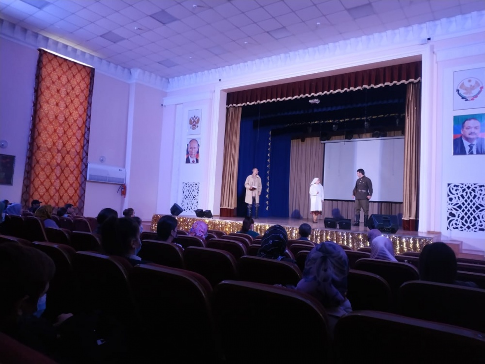 Открывая мероприятие, выступил начальник отдела по антитеррористической работе Исрапил Гусейнов, который от лица администрации района, поприветствовал артистов театра и собравшихся в зале, а также рассказал о цели данного мероприятия.О проявлении в современном мире экстремизма, агрессии, вражды и ненависти, а также о важности таких понятий как патриотизм, долг и совесть, терпимость к другим взглядам говорили выступившие перед молодежной аудиторией исполнительный директор театра Магомед Гусейнов, драматург и сценарист Марат Шахманов.