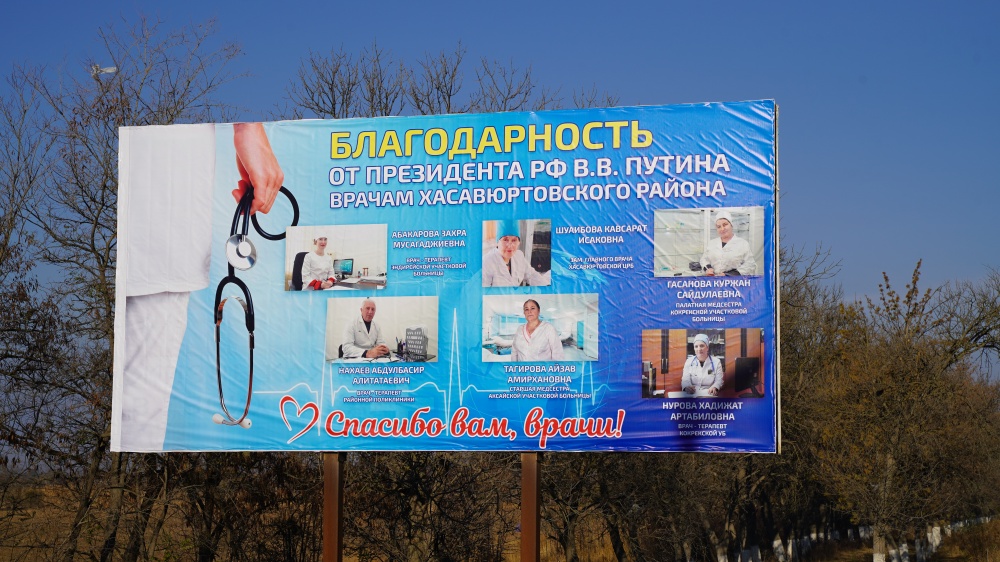 В Хасавюртовском районе установлен баннер с фотографиями медицинских работников, награжденных Президентом РФ Владимиром Путиным
