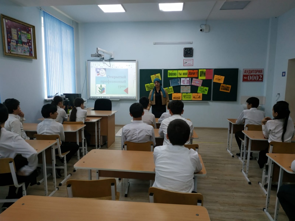 Уроки были проведены с учащимися 9-11 классов. Уроки проводили председатель первичной профорганизации и классные руководители 9-11 классов Гусейнова Джахбат, Ибрагимова Эмма, Мисербулатова Има и председатель профкома Устарханова Роза.