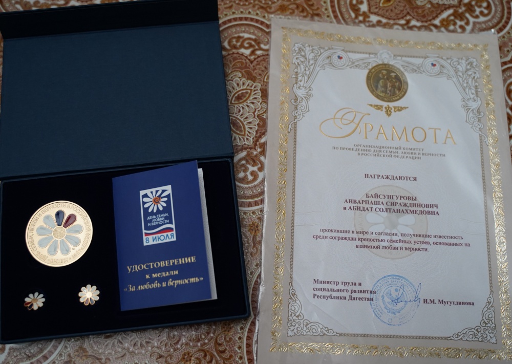 8 июля руководство Управления социальной защиты населения Хасавюртовского района посетило селение Аксай, где проживает семья Байсунгуровых. Отметим, что супруги Анварпаша и Абидат проживают вместе 50 лет и воспитали 4-х детей, которые окончили вузы и создали уже свои семьи. Вручая награду, начальник УСЗН Эльдар Гаджиалиев, подчеркнул, что Байсунгуровы известная и очень уважаемая в селе семья, получившая известность среди сограждан крепостью семейных устоев, основанных на взаимной любви и верности, а также добившиеся благополучия, обеспеченного совместным трудом, воспитавшие детей достойными членами общества.