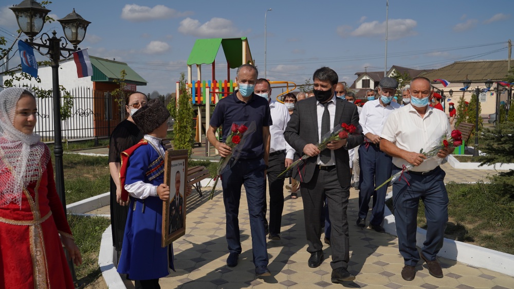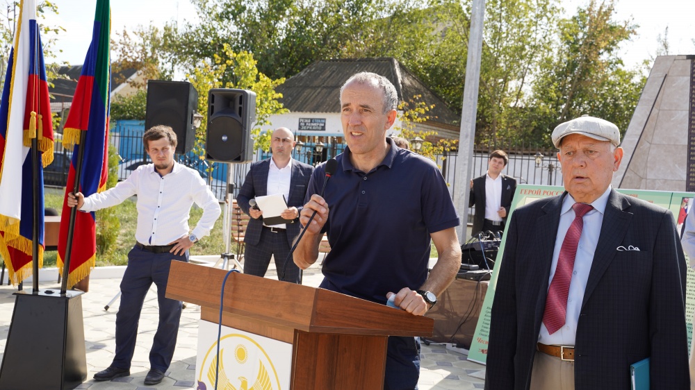 После возложения цветов к памятнику ветеранам Великой Отечественной войны участниками мероприятия, управляющий делами администрации МР Муслим Алисултанов зачитал автобиографию Героя России.