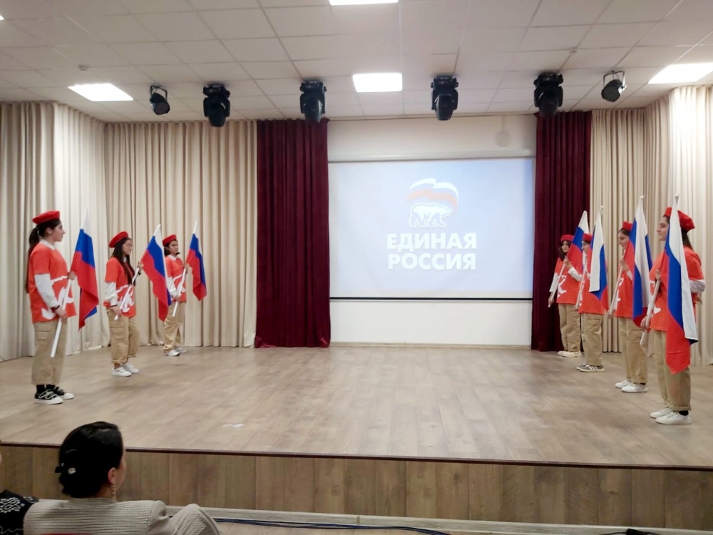 Затем ученики старших классов выступили с чтениями стихов и пением песень о Родине, показали флешмоб с флагами России и «ЕДИНОЙ РОССИИ».