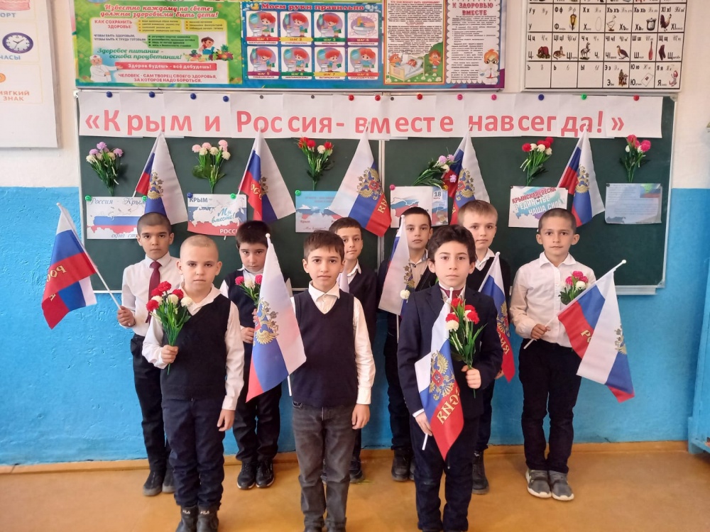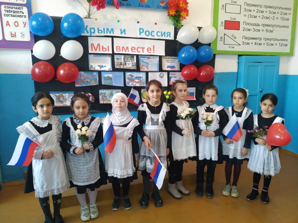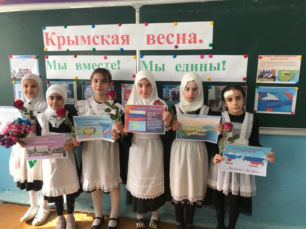 В целях гражданско-патриотического воспитания детей и в связи с исторической датой присоединения Крыма к России в период с 14 по 18 марта 2023 года в школах Хасавюртовского района прошли памятные мероприятия. Это общешкольные торжественные линейки «Россия и Крым – общая судьба», целью которого было показать историческую роль полуострова Крым в истории и современности России, миротворческий и гуманистический характер действий России при защите своих интересов и русскоязычного населения Крыма и Севастополя, оказавшегося в трудной ситуации в результате политического переворота в Украине. Высказывание «Мы вместе – мы едины» стало девизом уроков Мужества. В старших классах прошли уроки – презентации. Учителя истории и обществознания рассказали об истории Крыма, о событиях, приведших к всенародному референдуму в Крыму и о создании Крымской Республики. Учащиеся получили сведения о географическом положении Крыма, о его историческом и культурном прошлом. В начальных классах прошли классные часы «Крымская весна». Под руководством классных руководителей прошли классные часы «Мы вместе! Мы едины!». На уроках дети перечисляла основные исторические вехи политических событий на Украине, провела заочное путешествие по местам Крымского полуострова, по итогам которых выполнены рисунки. Учащиеся в стихотворной форме высказали значимость такого события в истории нашей страны. Классные руководители рассказали детям в доступной форме с помощью презентации на тему: «Россия и Крым – вместе навсегда», посвященной воссоединению РФ и Крымской республики.
