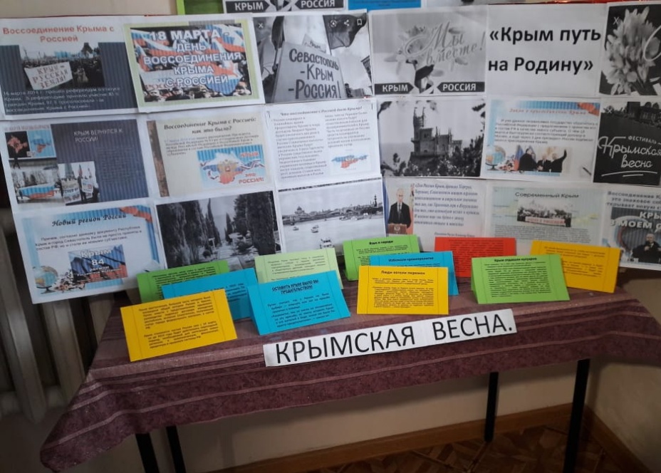В учреждениях культуры и библиотеках поселений проходит цикл патриотических мероприятий под эгидой « Крымская весна», где молодому поколению района рассказывают об историческом значении воссоединение России и Крыма. Так в библиотеках поселений методическим отделом ЦБС оформлены выставки « Крымская весна», с информационной подборкой «Крым – Россия! Навсегда!», где юным читателям рассказывают об истории полуострова в прошлом и настоящем, о народах, проживающих на крымской земле, о живописной флоре и фауне, красотах полуострова и самых известных достопримечательностях. На обзорах книжной выставки представлены книги русских писателей, оставивших свои яркие заметки и рассказы о Крыме: А. С. Пушкина, М. А. Булгакова «Путешествие по Крыму », Л. Улицкой «Медея и ее дети », М. А. Волошина «Путник по Вселенным », А. С Грина «Алые паруса », «Бегущая по волнам », «Золотая цепь». Тем временем в центрах культуры поселений, проходят конкурсы чтецов на тему патриотической поэзии « Крымская весна», где дети в стихах выражали свои чувства о самом святом – любви к своей Отчизне, своему краю, способствующие воспитанию у молодежи чувства гордости и уважения к истории своей страны, ее достижениям и достоянию, воспитанию толерантности и дружеских отношений между братскими народами. Стоит отметить, что в рамках мероприятий также проходят познавательные часы, виртуальные экскурсии, беседы, слайд — путешествия, уроки слушания, информационные часы об истории Крыма, его достопримечательностях, об известных людях, оставивших заметный след в истории полуострова.