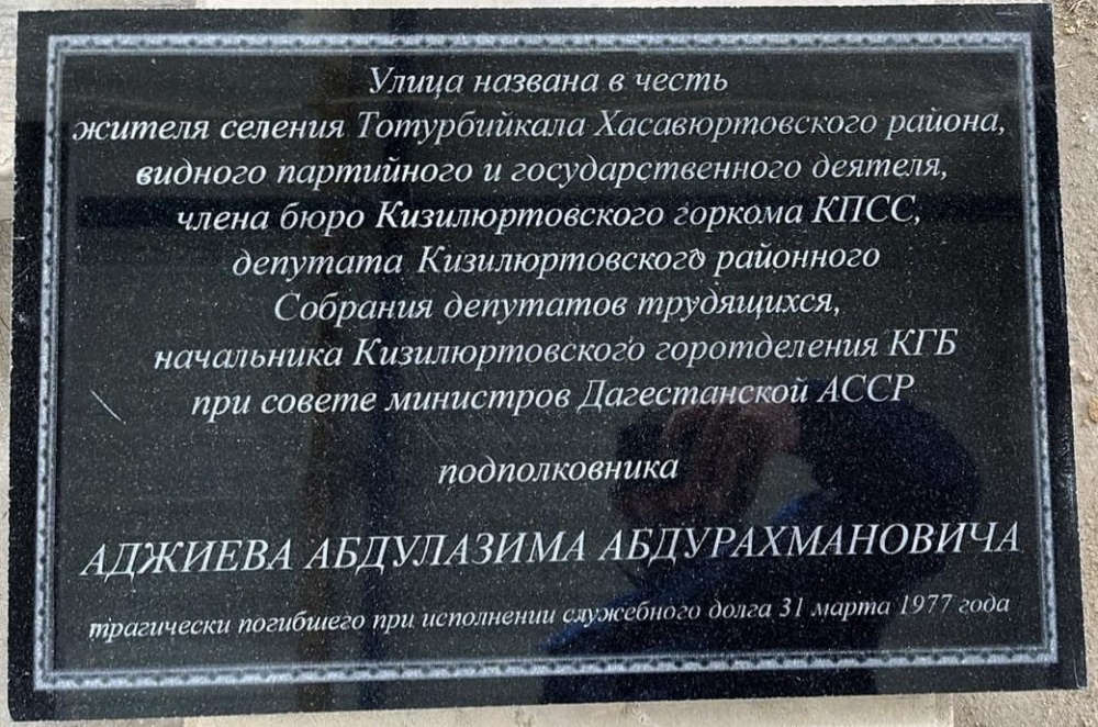 Накануне, в селении Тотурбийкала в честь 80 – ой годовщины Великой Победы, состоялось торжественное мероприятие, присвоение улице селения Тотурбийкала именем видного партийного и государственного деятеля Аджиева Абдулазима Абдурахмановича. По поручению Главы МР Арсланбека Алибекова, на церемонии открытия, выступил управляющий делами администрации МР Джанболат Алиханов, отметив все этапы жизненного пути и заслуги Аджиева Абдулазима.