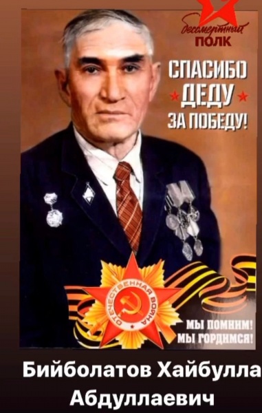 Бийболатов Хайбулла Абдуллаевич, родился 5 апреля в 1921г. в с.Андрейаул Хасавюртовского района Дагестанской АССР. В 1929г. поступил в Андрейаульскую начальную школу и окончил её в 1934г. В том же году поступил в Хасавюртовское педучилище им. З.Батырмурзаева и в 1938г. окончил его.