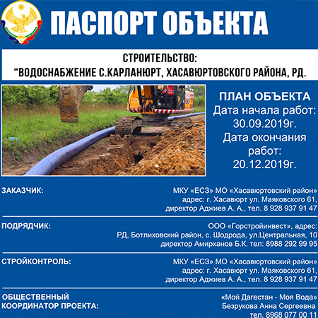 — с. Карланюрт – разводящие сети водоснабжения, в т.ч. разработка ПСД на сумму 40000,0 тыс. руб. контрактная сумму 32550 тыс. руб.; По разводящим сетям с.Карланюрт 23.08.2019 г. состоялся электронный аукцион, где определился подрядчик, но поэтому объекту в УФАС РД поданы 2 жалобы. После соответствующего решения УФАС РД будут проведены процедуры по определению подрядчика 29.08.2019г. В с.Карланюрт в программу на 2019 год включено строительство 19,216 км. внутренних водопроводных сетей, 2-х резервуаров, насосной и бактерицидной установки; Чек лист