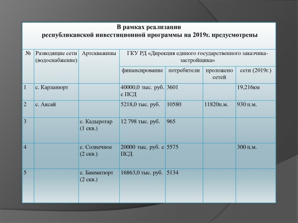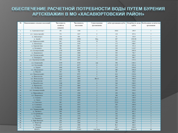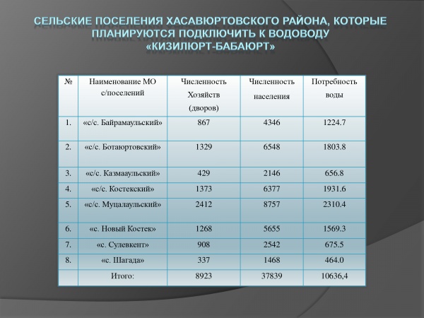По всем перечисленным населенным пунктам ООО «Даггеомониторинг» подготовило задание, на проектирование которых администрация МО «Хасавюртовский район» представило в Минстрой РД для финансирования проектно-изыскательных работ и получения положительного заключения.