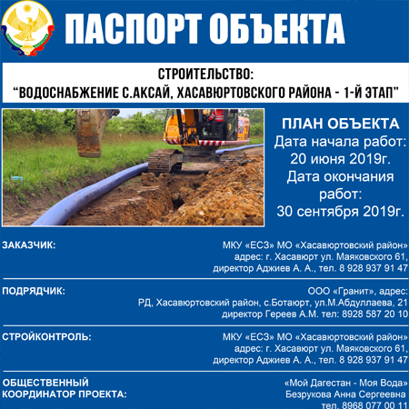 16 ноября в селении Аксай состоялось торжественное открытие властями района объекта водоснабжения, в рамках реализации федерального социального проекта « Мой Дагестан – моя вода». По поручению Главы Дагестана, Владимира Васильева, провести торжественный пуск объекта водоснабжения в селении Аксай прибыла общественный координатор проекта « Мой Дагестан – моя вода», депутат НС РД, Анна Безрукова, в сопровождении начальника отдела развития муниципальных образований Минэкономразвия РД Марат Абдулгамидов. В торжественном мероприятии приняли участие глава и актив села, депутатский корпус, общественные деятели, работники образования, культуры, социального центра, духовенство, жители.