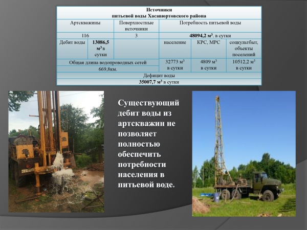 По 10 населенным пунктам (с. Боташюрт, с. Октябрьское, с. Эндирей, с. Нурадилово, с. Хамавюрт, с. Новосаситли, с. Новосельское, с. Ботаюрт, с. Кандаураул, с. Пятилетка) в рамках Республиканской инвестиционной программы ООО «Даггеомониторинг» проведено гидрогеологическое обследование территории сельских поселений с целью улучшения водоснабжения за счет подземных вод.