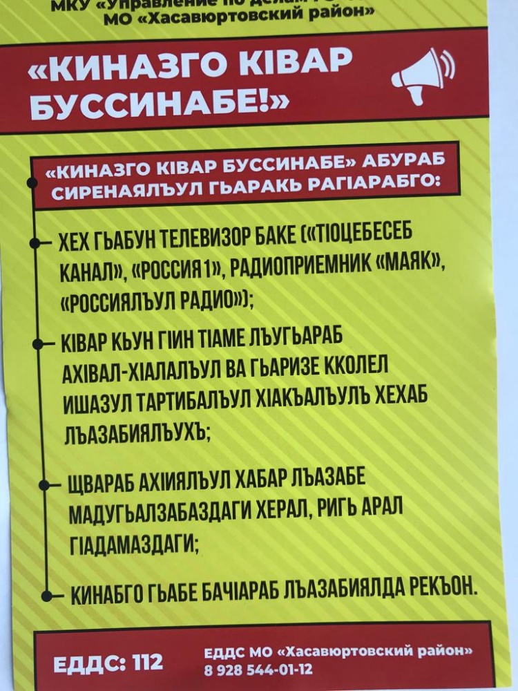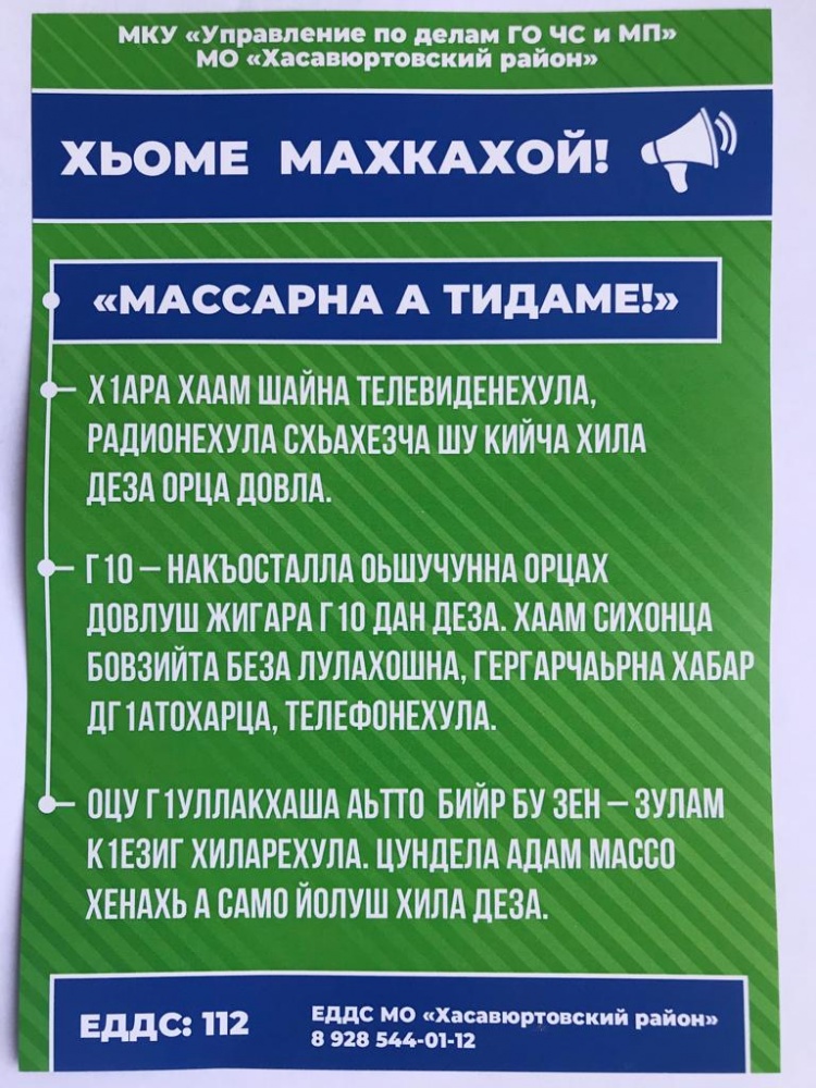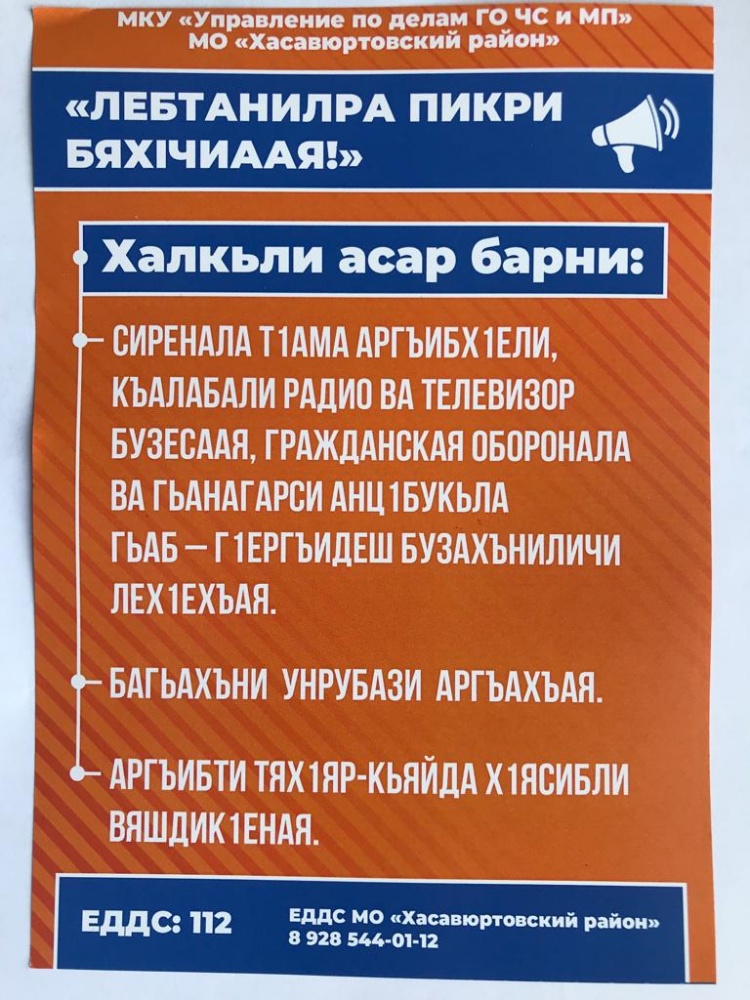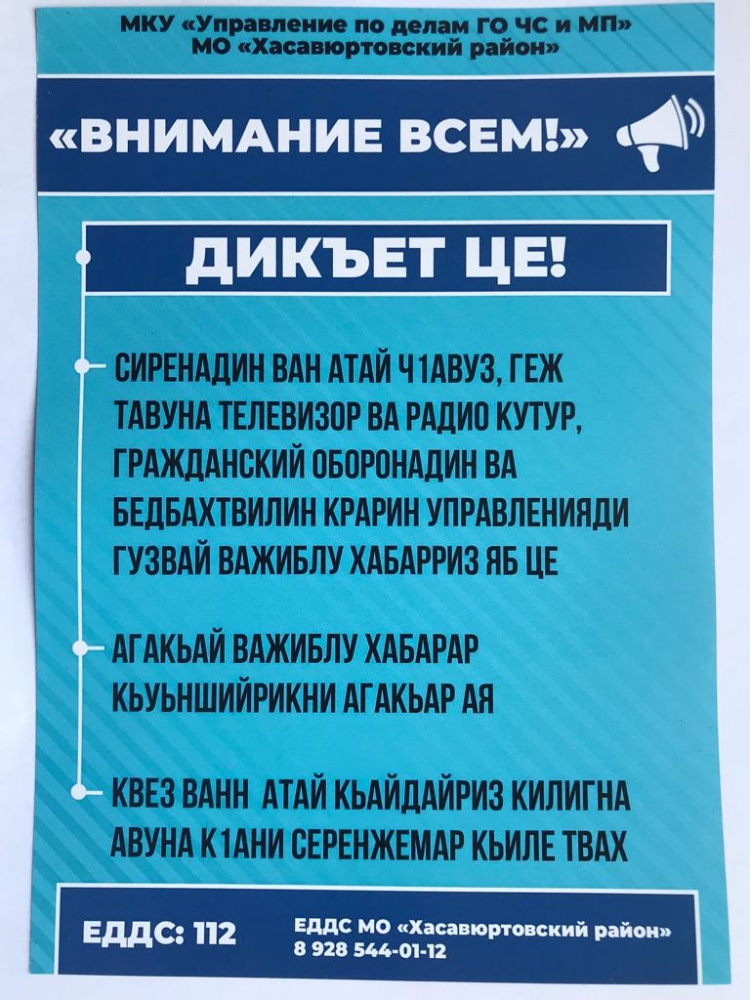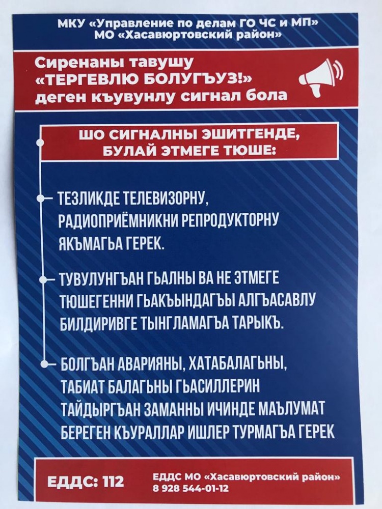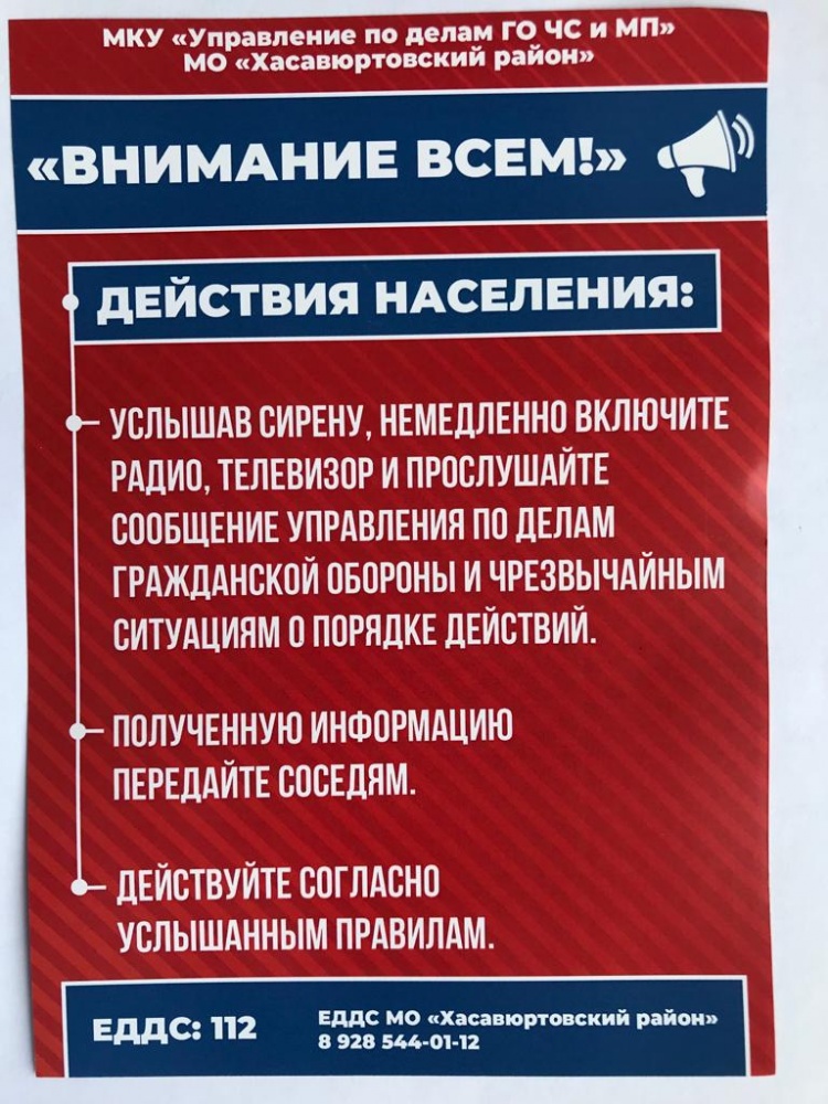 Во исполнение пункта 10 раздела 2 Плана мероприятий по исполнению пунктов протокола № 4 от 16.12.2022г., заседания Комиссии при Главе Республики Дагестан по предупреждению и ликвидации чрезвычайных ситуаций и обеспечению пожарной безопасности, протокола №1 от 10.01.2023г. Совещания при Главе МО «Хасавюртовский район» разработаны и распространяются памятки на родном языке (кумыкский, чеченский, аварский, даргинский, лезгинский) по действиям населения при получении сигнала «ВНИМАНИЕ ВСЕМ !».