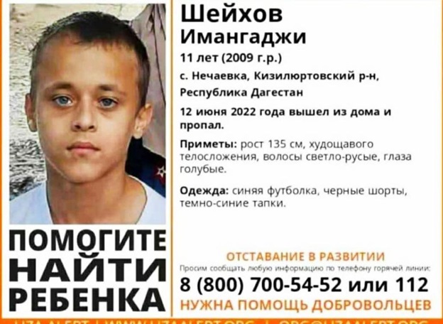 По поручению главы муниципального района Арсланбека Алибекова спасатели УГОЧС и МП МО «Хасавюртовский район» приняли участие в поисках в с. Нечаевка, Кизилюртовского района пропавшего 11- летнего Имангаджи Шейхова, мальчика ищут больше двух суток. 12 июня он вышел из дома своей бабушки (у которой гостил в эти дни) приблизительно после 13.00 и больше не вернулся. Родители сначала вели самостоятельные поиски сына, а затем обратились в правоохранительные органы.